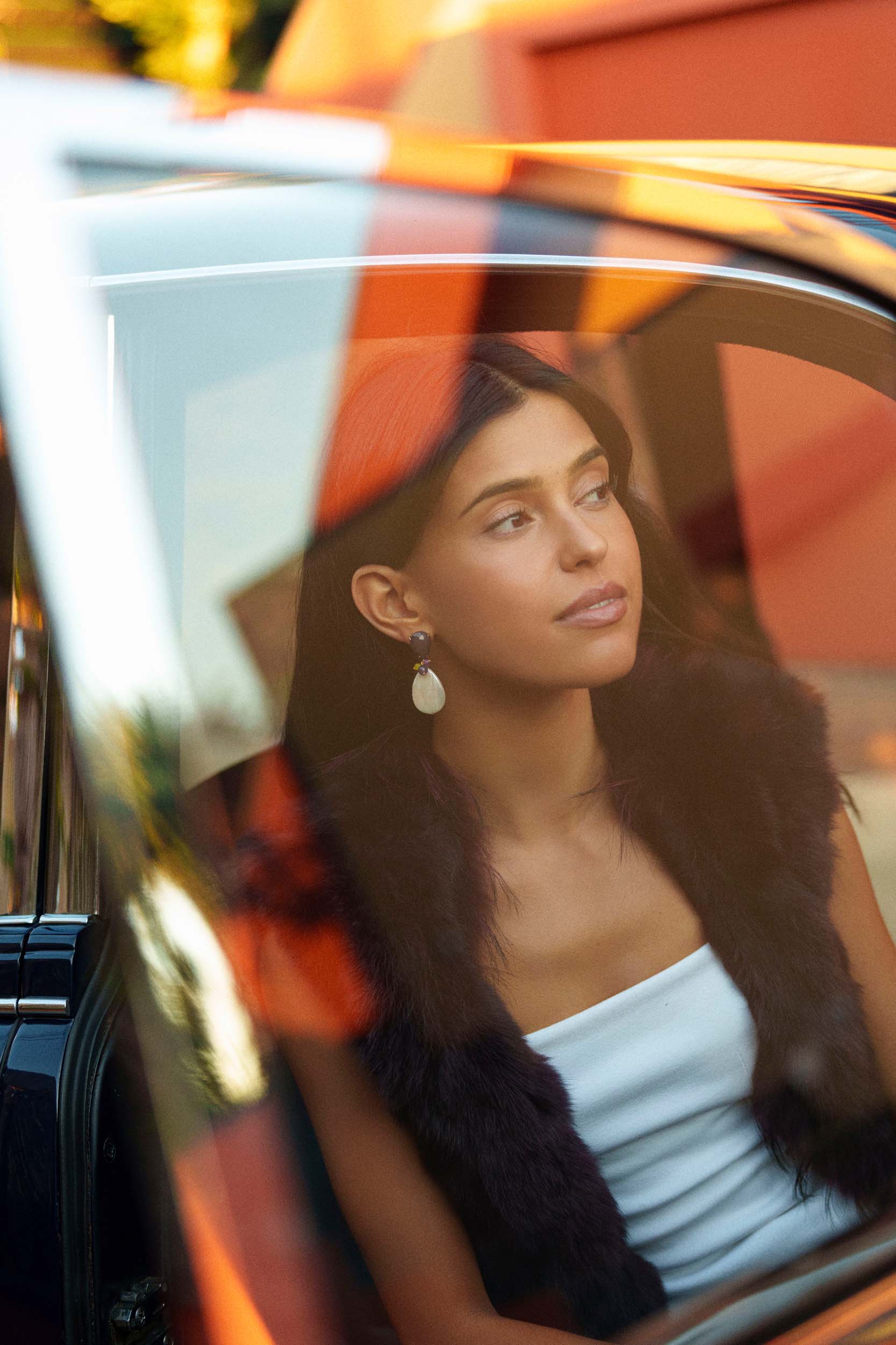 Sculptural earrings with Viola Purple, Pearl White and vibrant jewel accents. Feminine, modern and luminous.