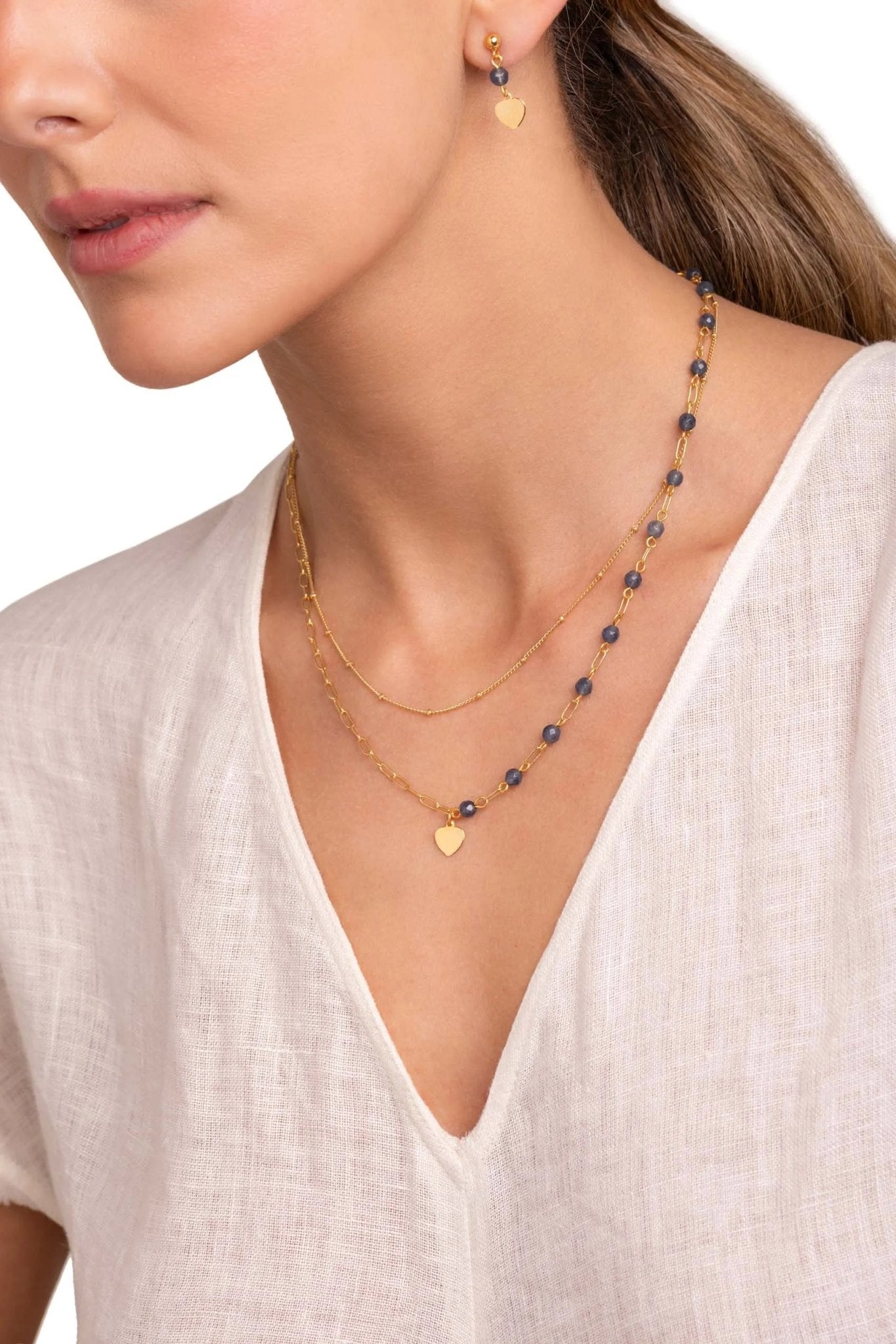 Los Pendientes Heart Beaded, con piedras naturales y charms de corazón, están hechos a mano en Portugal, ofreciendo un estilo romántico y sofisticado.