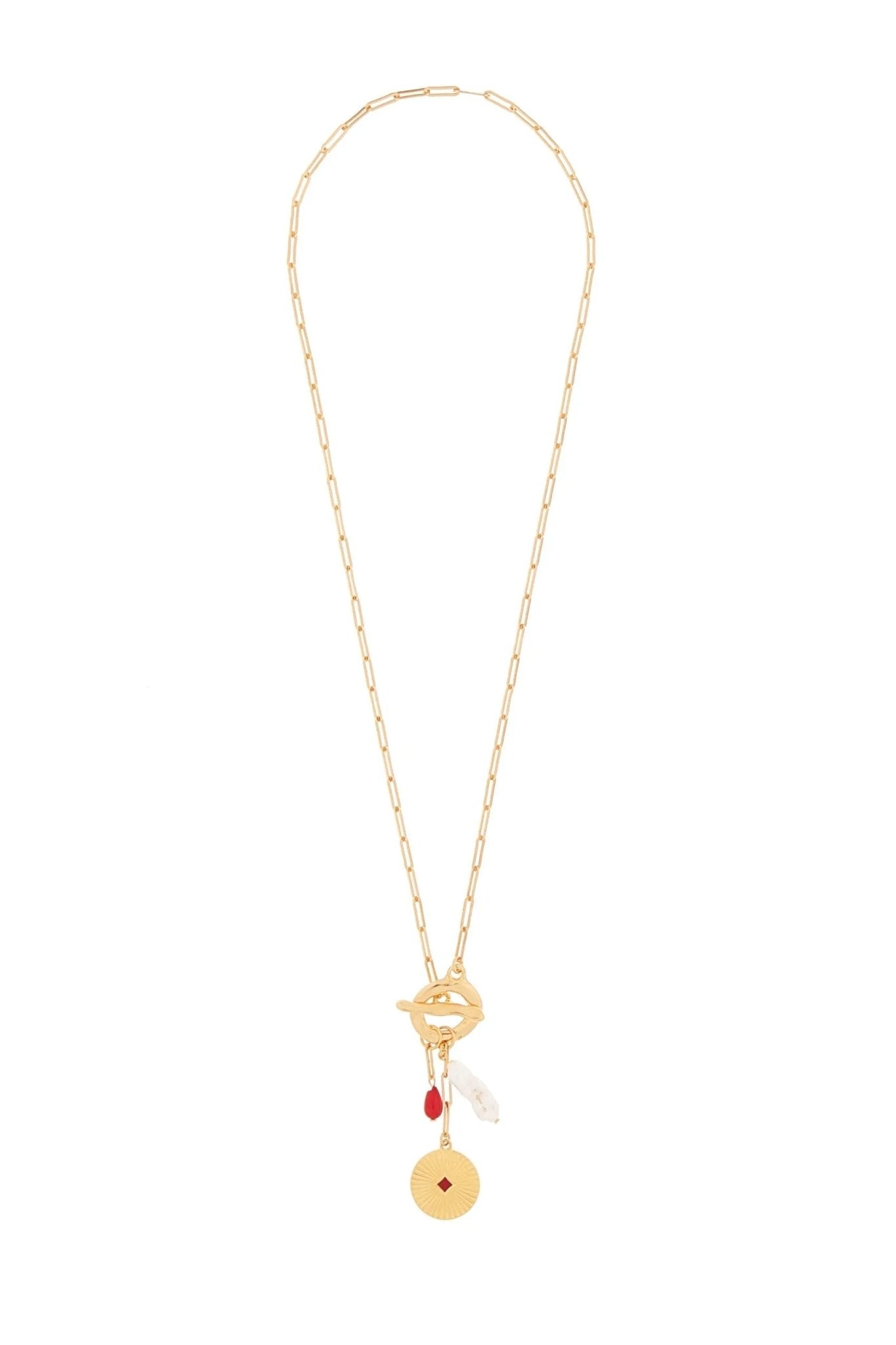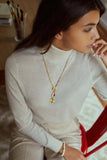 El Collar Milano combina tradición y modernidad con su cadena premium bañada en oro, perla barroca, piedra natural y colgante étnico. Una joya con textura y personalidad.